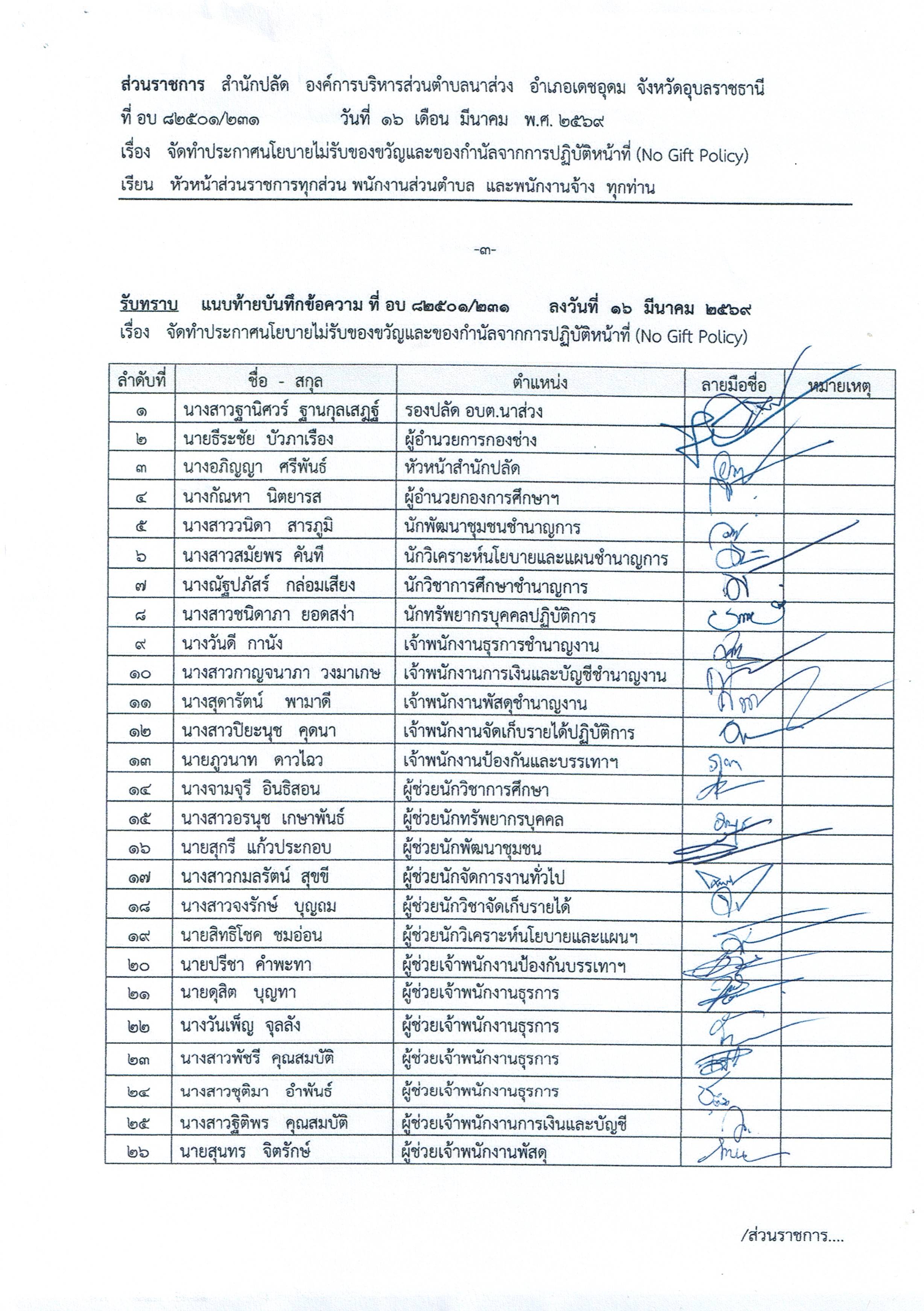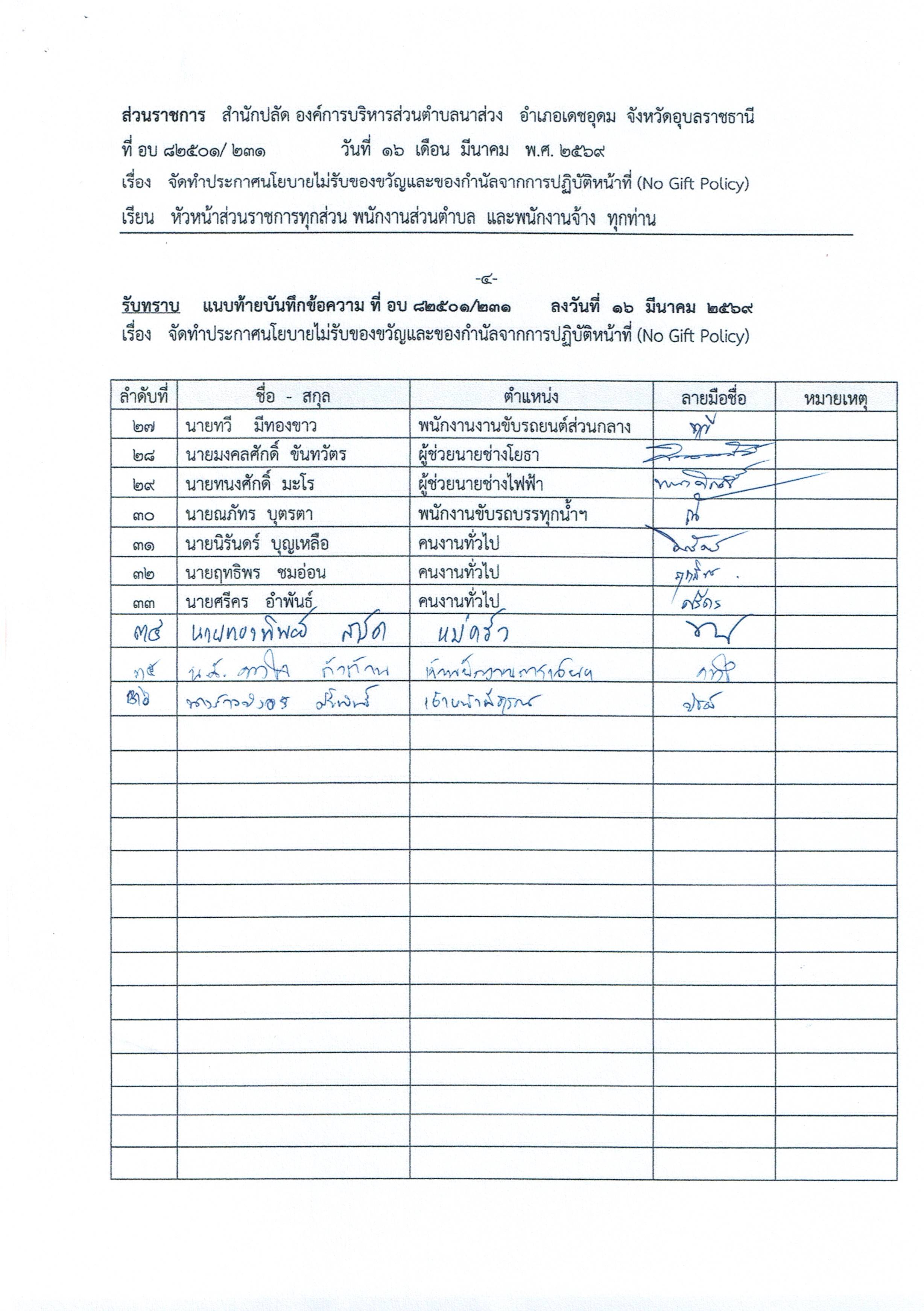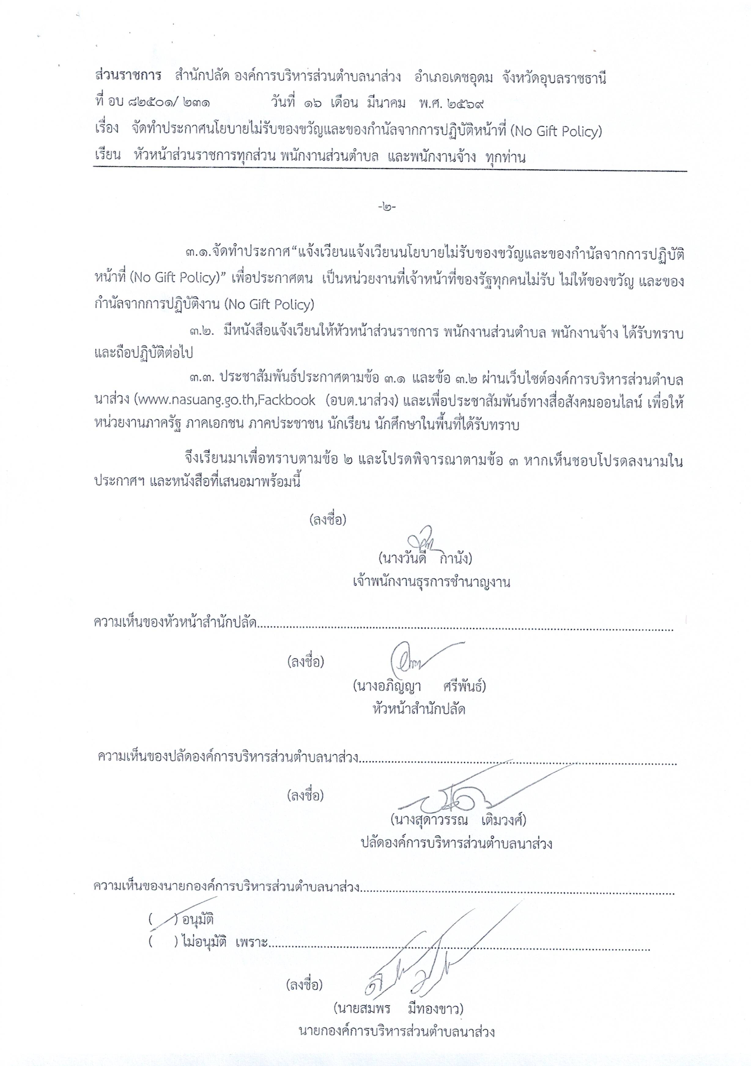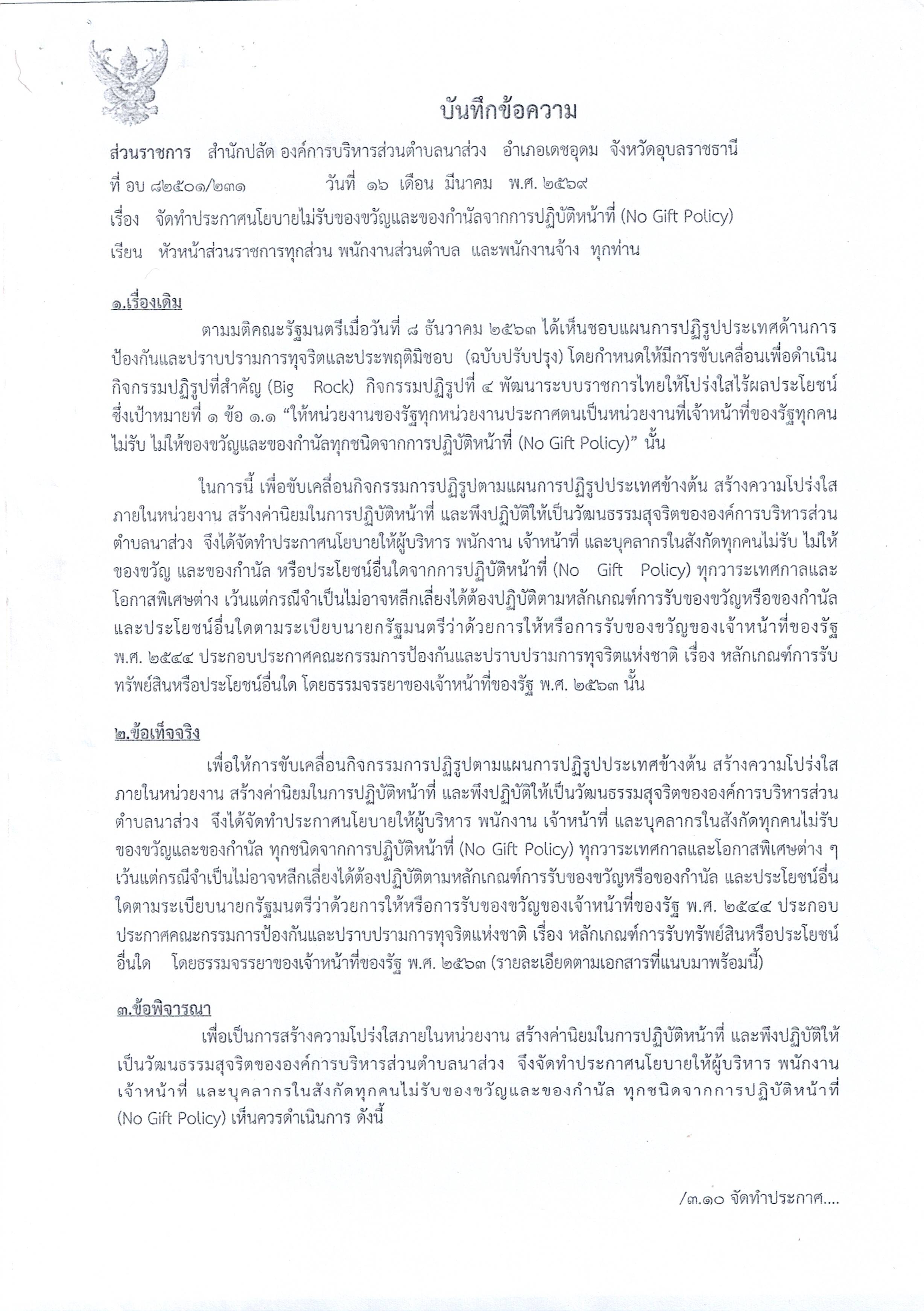 จัดทำประกาศนโยบายไม่รับของขวัญและของกำนัลจากการปฏิบัติหน้าที่ (No Gift Policy)