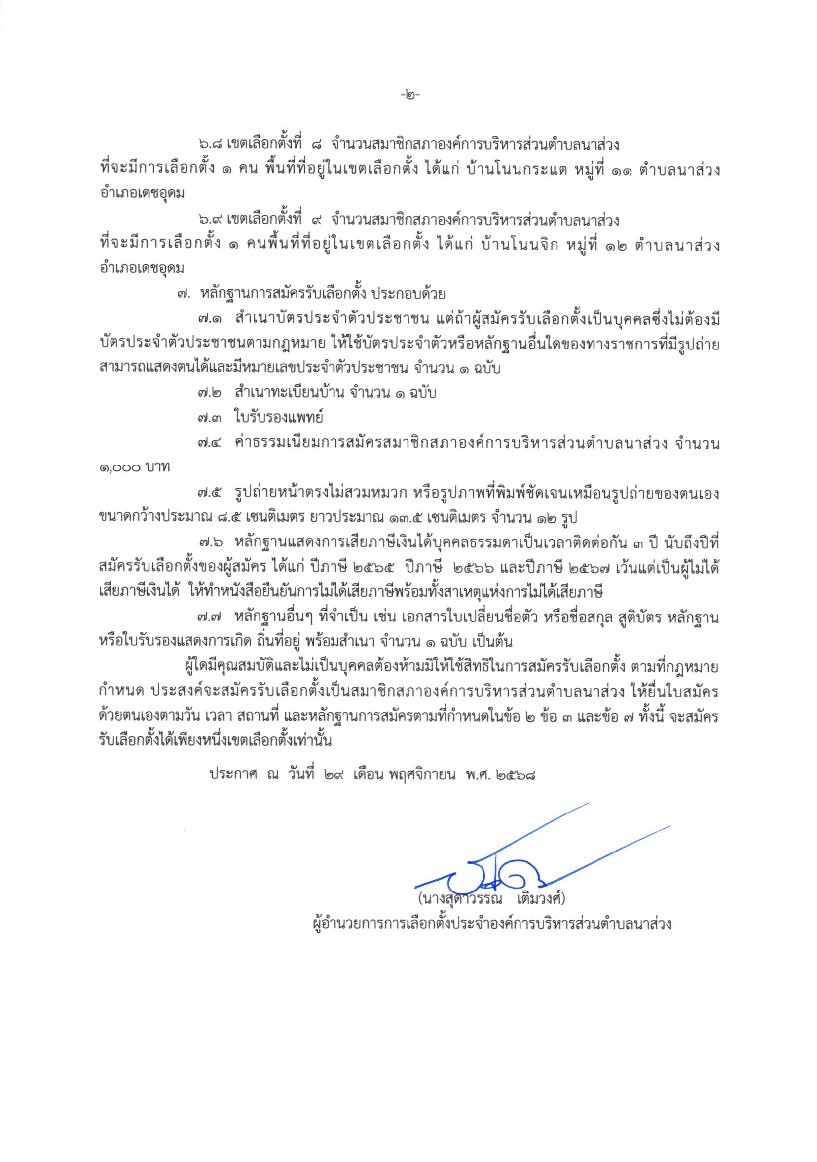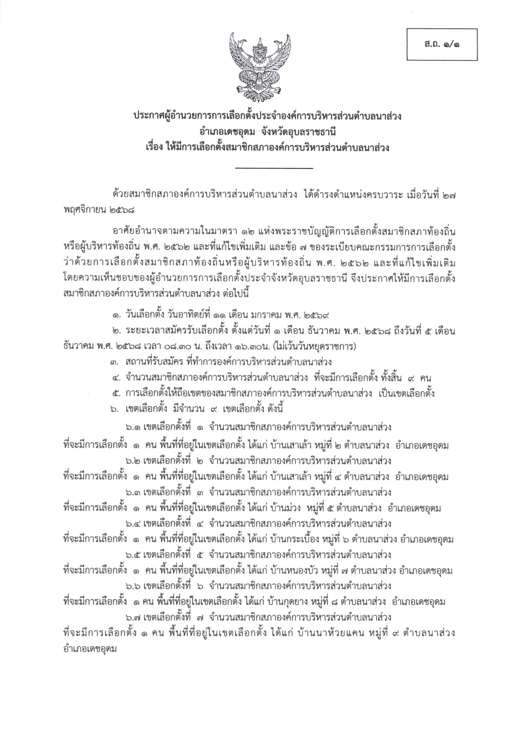 ประกาศผู้อำนวยการการเลือกตั้งประจำองค์การบริหารส่วนตำบลนาส่วง เรื่อง ให้มีการเลือกตั้งสมาชิกสภาองค์การบริหารส่วนตำบลนาส่วง (ส.ถ. 1/1)