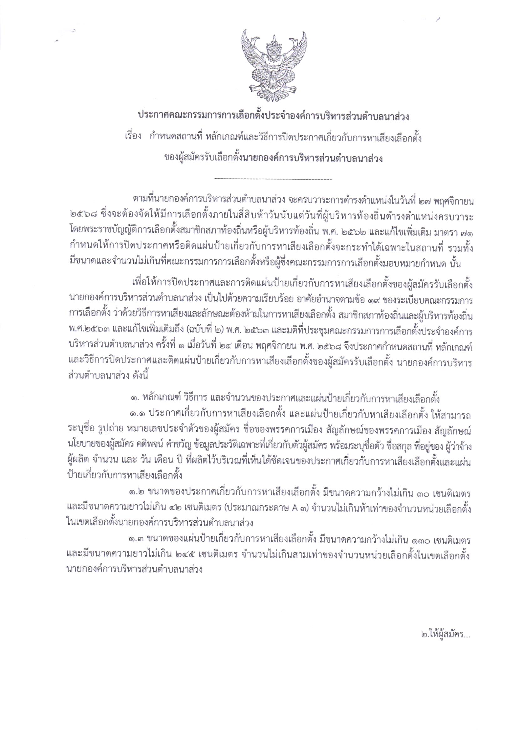 ประกาศคณะกรรมการการเลือกตั้งประจำองค์การบริหารส่วนตำบลนาส่วง เรื่องกำหนดสถานที่ หลักเกณฑ์และวิธีปิดประกาศเกี่ยวกับการหาเสียงเลือกตั้งของผู้สมัครรับเลือกตั้งนายกองค์การบริหารส่วนตำบลนาส่วง