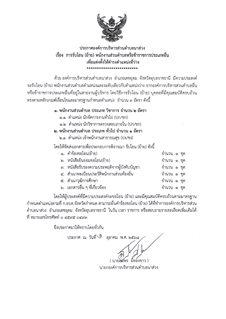 ประกาศองค์การบริหารส่วนตำบลนาส่วง เรื่อง การรับโอน (ย้าย) พนักงานส่วนตำบลหรือข้าราชการประเภทอื่นเพื่อแต่งตั้งตำแหน่งที่ว่าง วันอังคาร, 30 กันยายน 2568 13:32 Print Email back to top