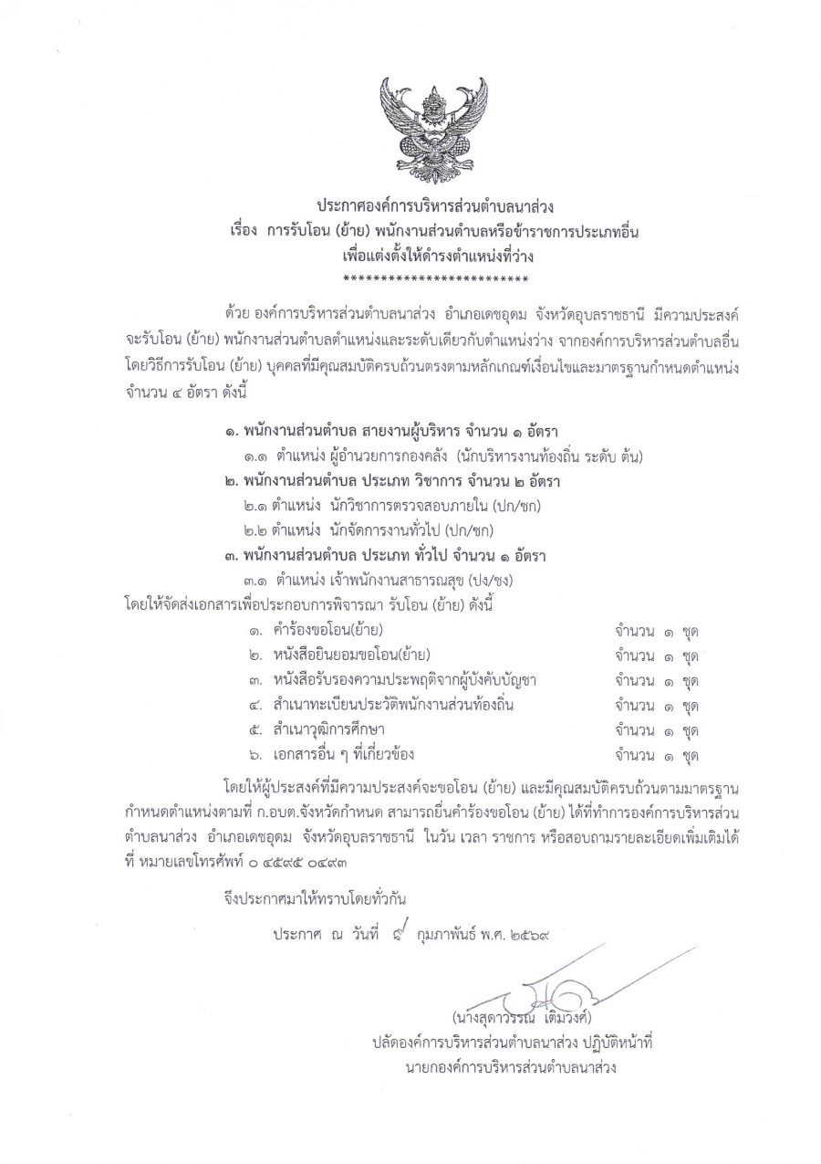 ประกาศองค์การบริหารส่วนตำบลนาส่วง เรื่อง การรับโอน (ย้าย) พนักงานส่วนตำบลหรือข้าราชการประเภทอื่น เพื่อเเต่งตั้งให้ดำรงตำแหน่งที่ว่าง วันจันทร์, 09 กุมภาพันธ์ 2569 09:34 Print Email back to top