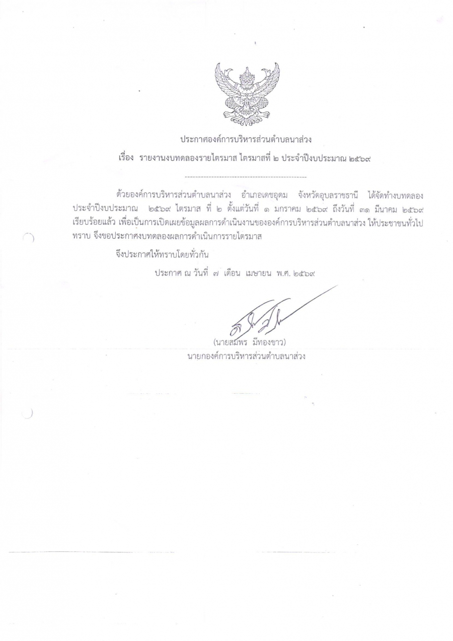 รายงานงบทดลองรายไตรมาส ไตรมาสที่ 2 ประจำปี 2569 วันอังคาร, 07 เมษายน 2569 10:28 Print Email ดาวน์โหลดเอกสาร Image_001.pdf (8 Downloads) back to top