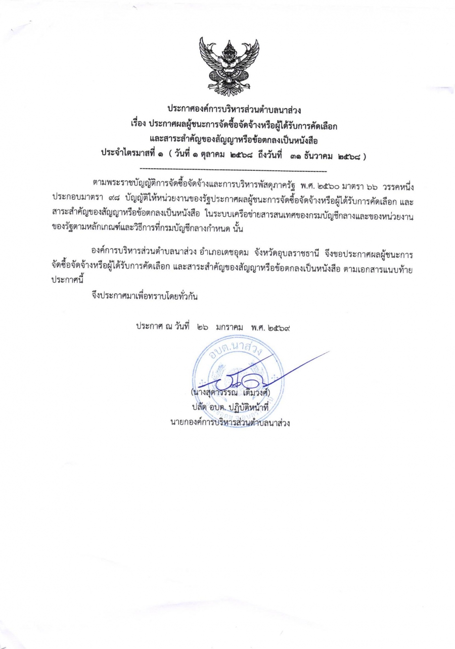 ประกาศองค์การบริหารส่วนตำบลนาส่วง เรื่อง ประกาศผลผู้ชนะการจัดซื้อจัดจ้างหรือผู้ได้รับการคัดเลือกและสาระสำคัญของสัญญาหรือข้อตกลงเป็นหนังสือ
