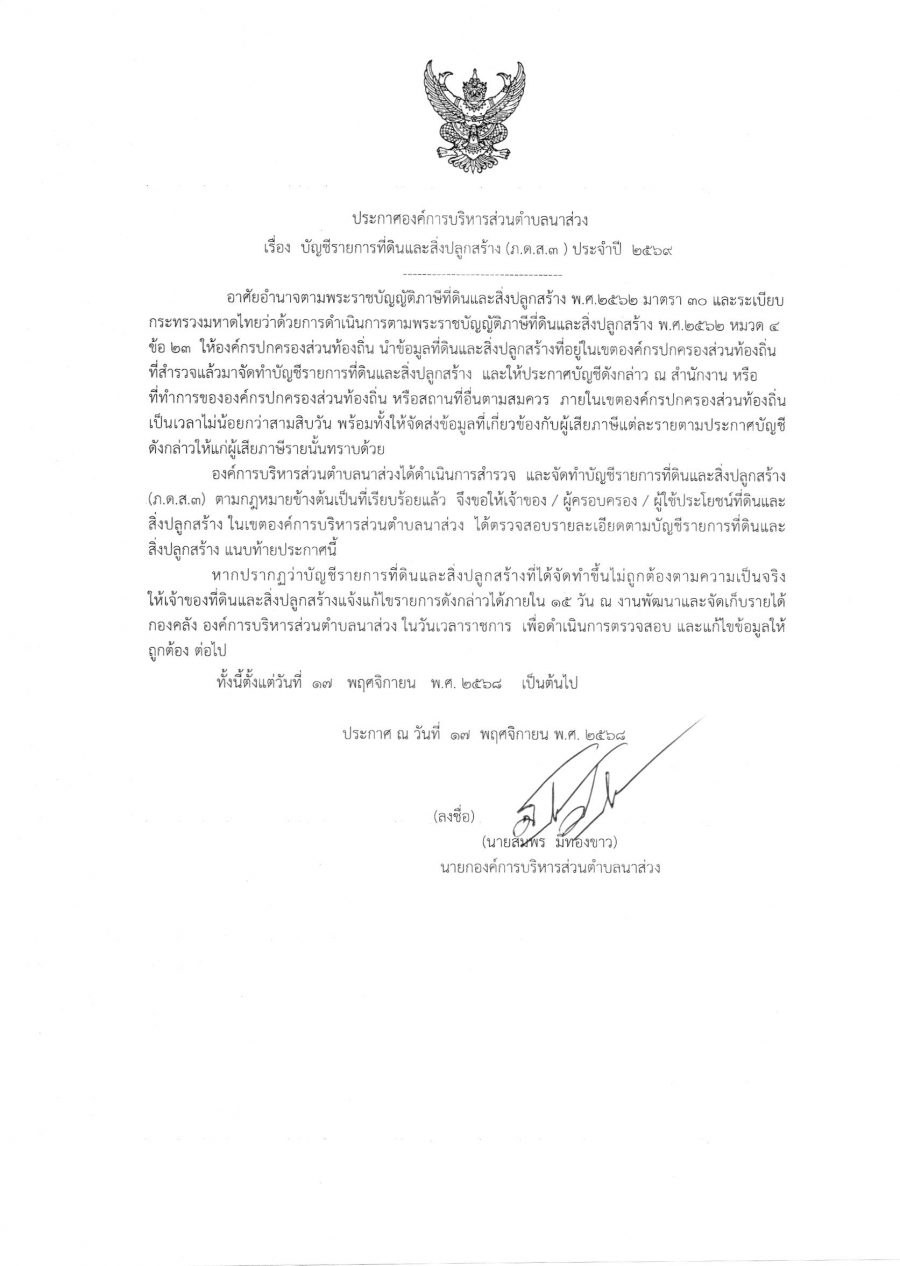 ประกาศองค์การบริหารส่วนตำบลนาส่วง เรื่อง บัญชีรายการที่ดินและสิ่งปลูกสร้าง (ภ.ด.ส.3) ประจำปี 2569 วันศุกร์, 14 พฤศจิกายน 2568 13:59 Print Email back to top