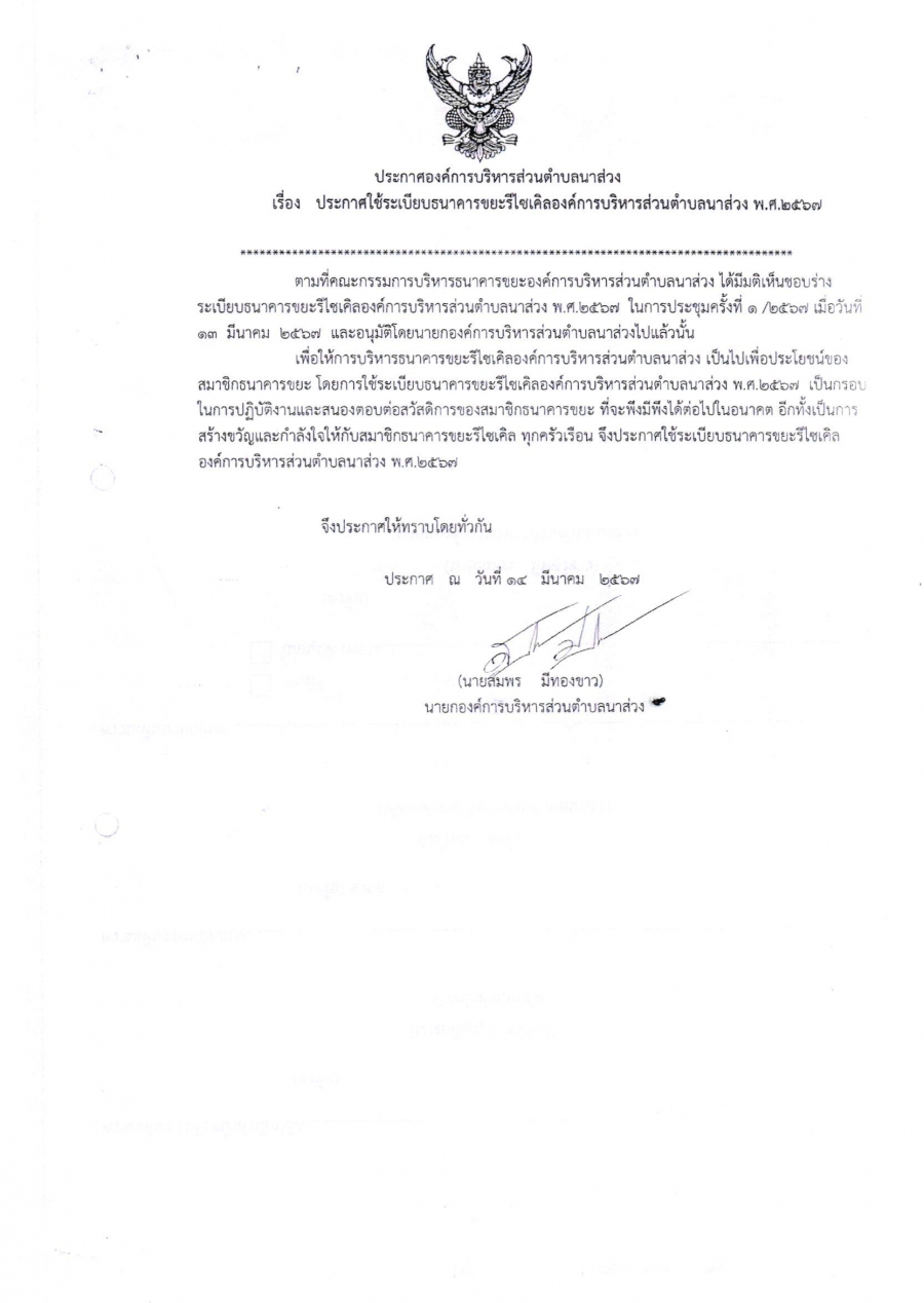 ประกาศองค์การบริหารส่วนตำบลนาส่วง เรื่อง ประกาศใช้ระเบียบธนาคารขยะรีไซเคิล ประจำปี 2567