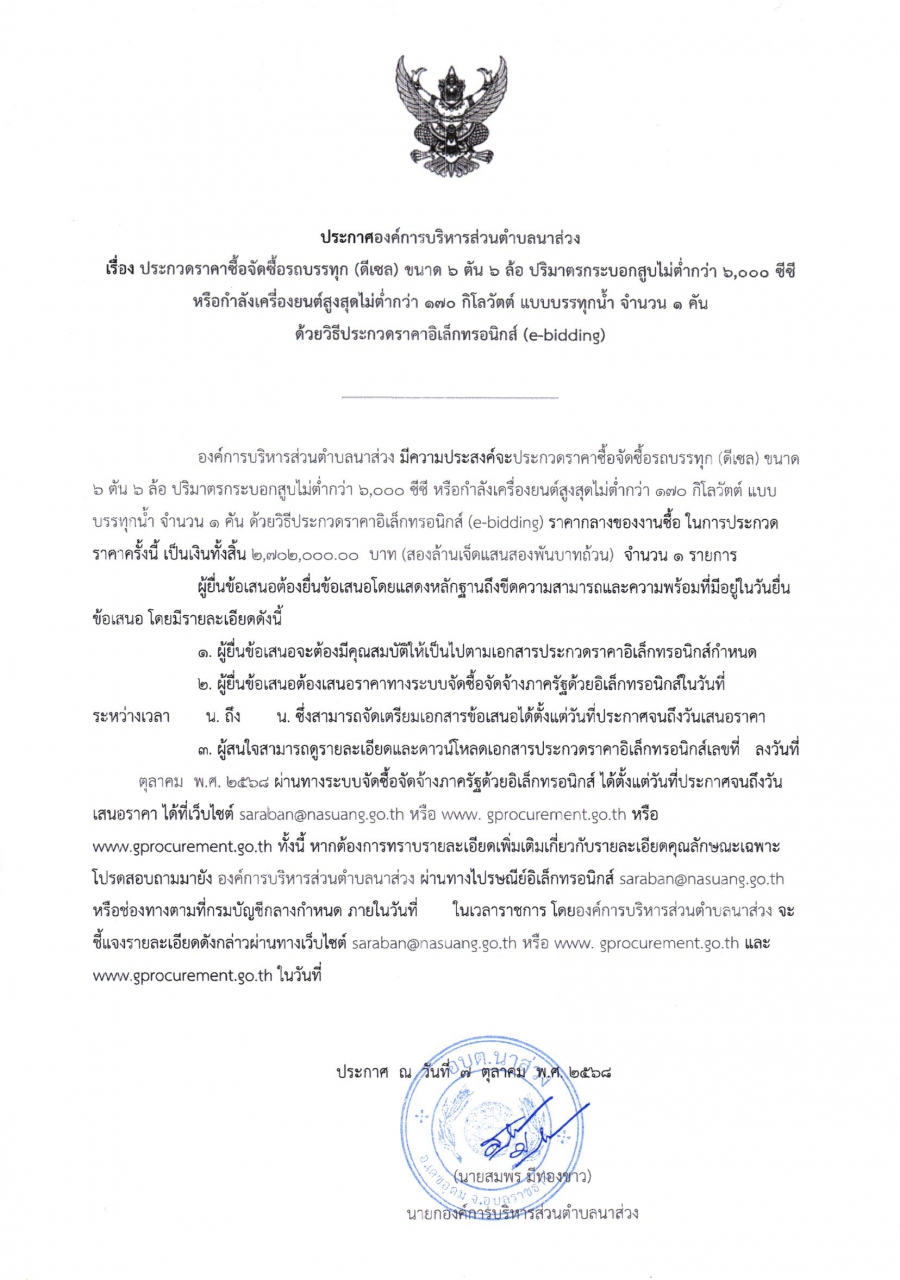 ประกาศองค์การบริหารส่วนตำบลนาส่วง เรื่อง ประกวดราคาซื้อจัดซื้อรถบรรทุก (ดีเซล) ขนาด 6 ตัน 6 ล้อ ปริมาตรกระบอกสูบไม่ต่ำกว่า 6,000 ซีซี หรือกำลังเครื่องยนต์สูงสุดไม่ต่ำกว่า 170 กิโลวัตต์ แบบบรรทุกน้ำ จำนวน 1 คัน ด้วยวิธีประกวดราคาอิเล็กทรอนิกส์